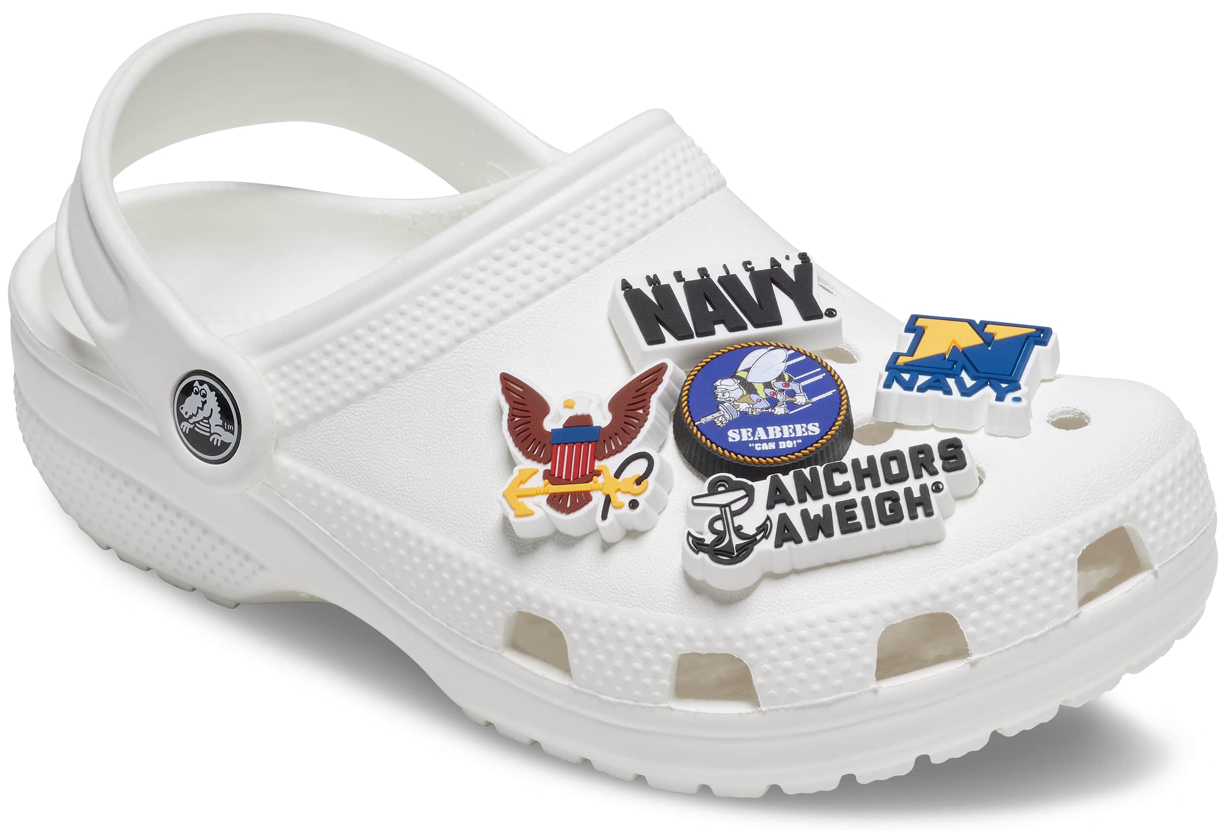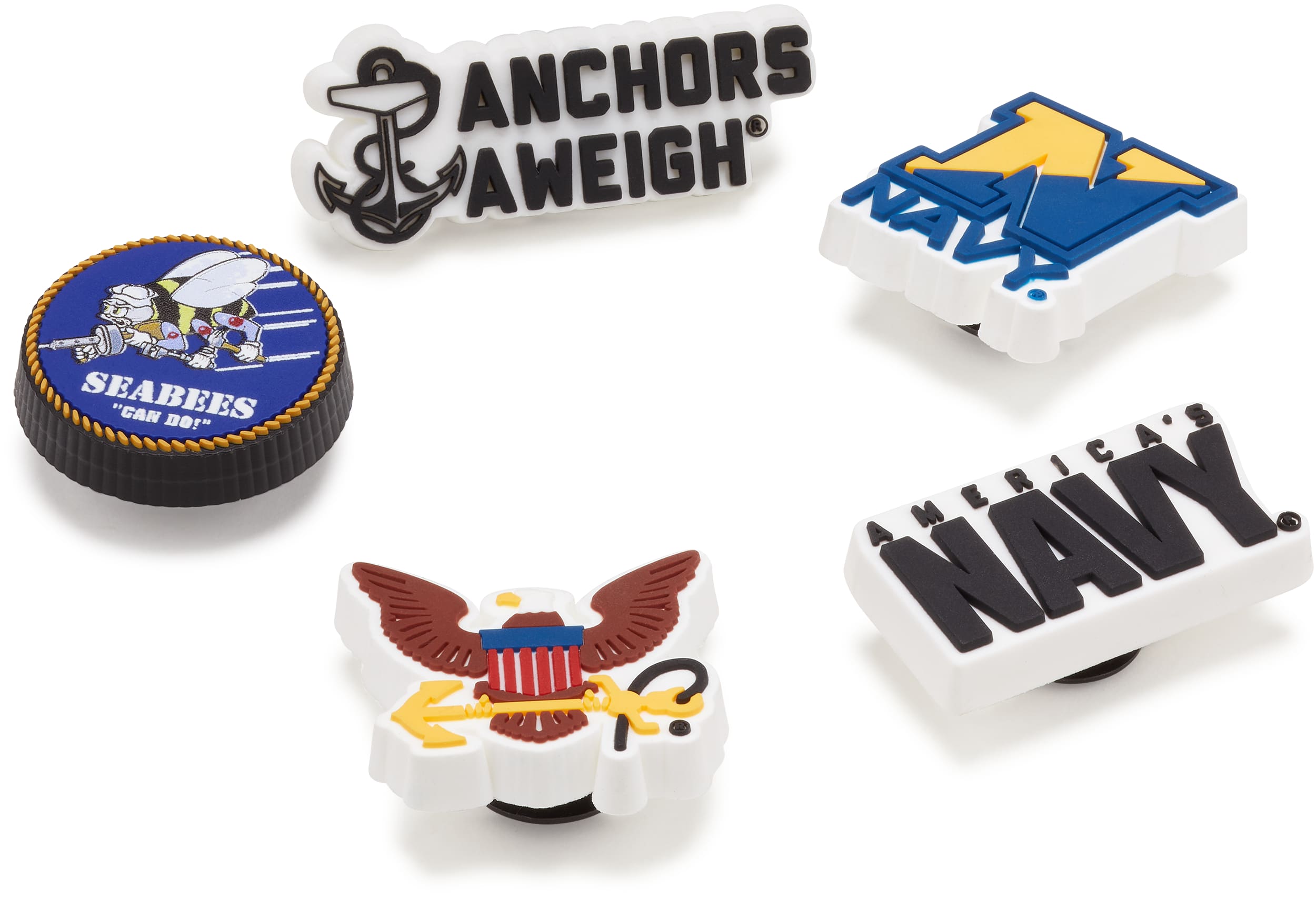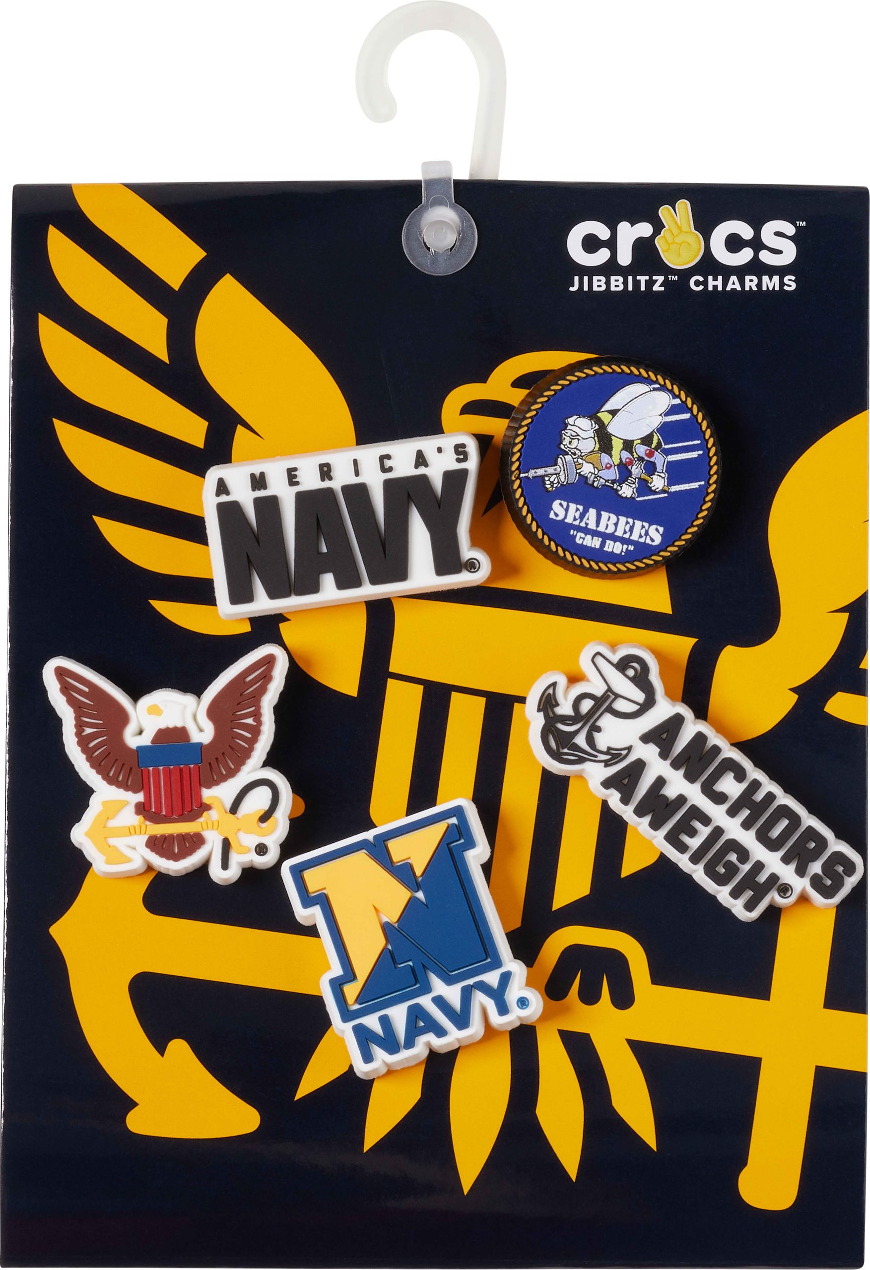 Pop some personality into your shoes with these Armed Forces US Navy 5 Pack Jibbitz™ charms. They’re the perfect addition to your favorite pairs of clogs, slides, and more.