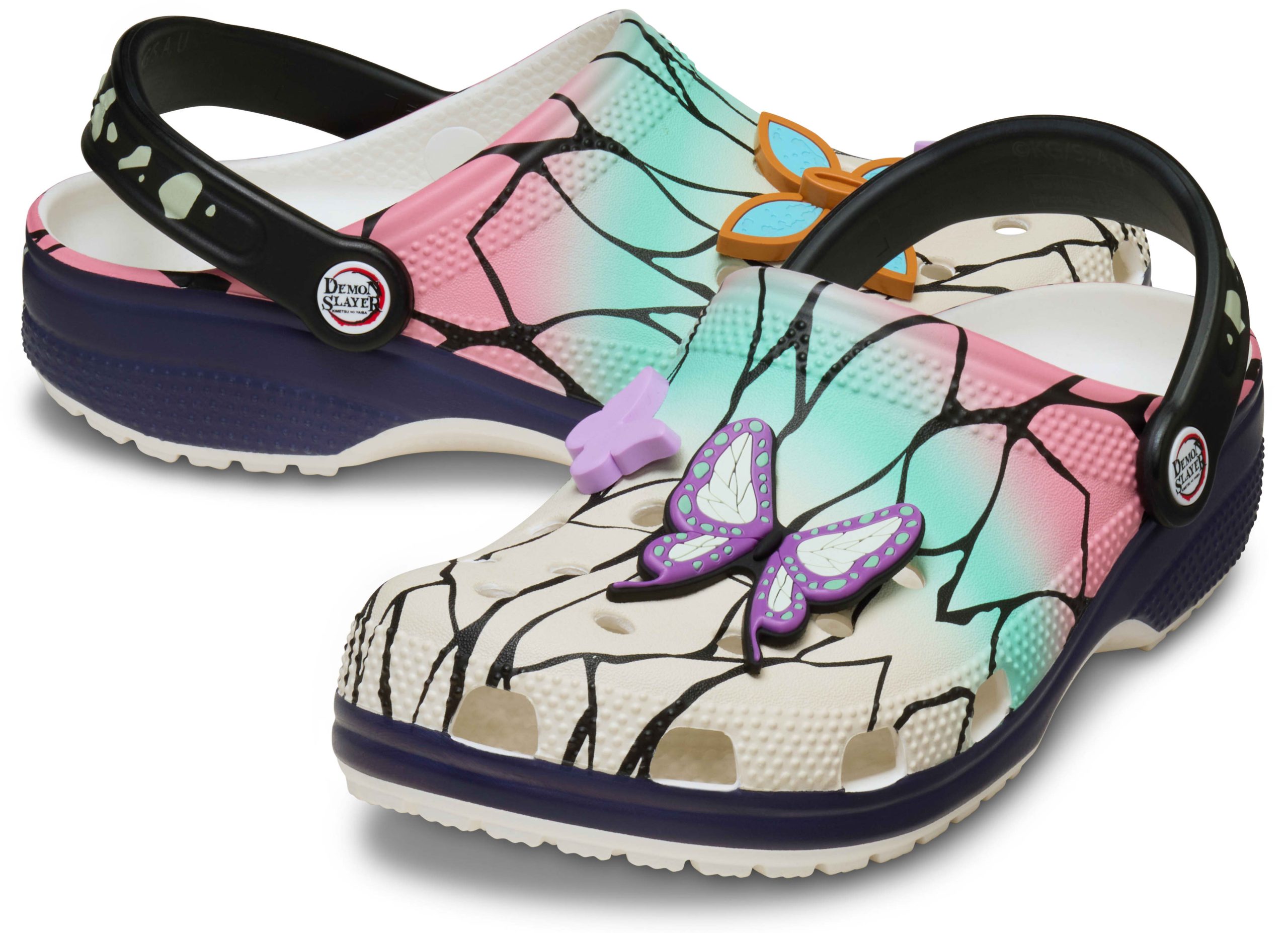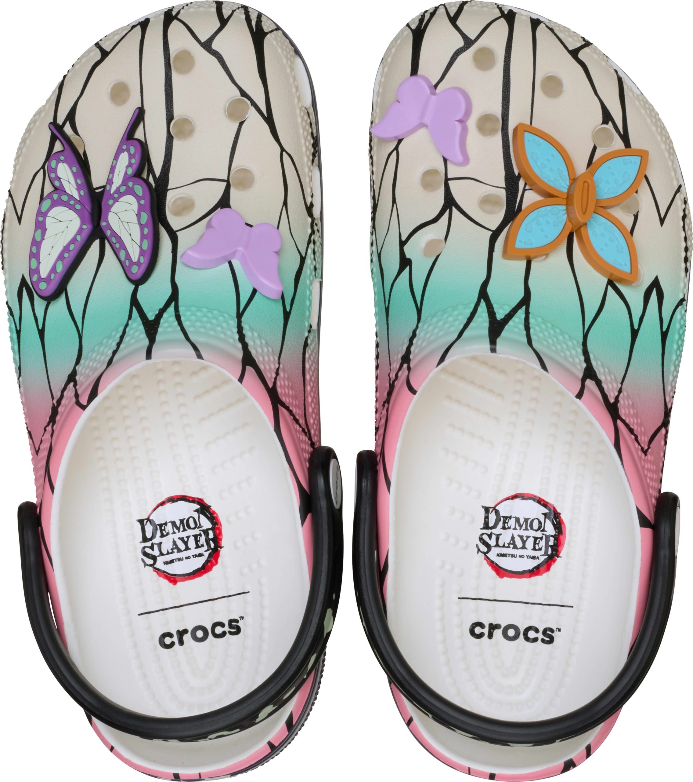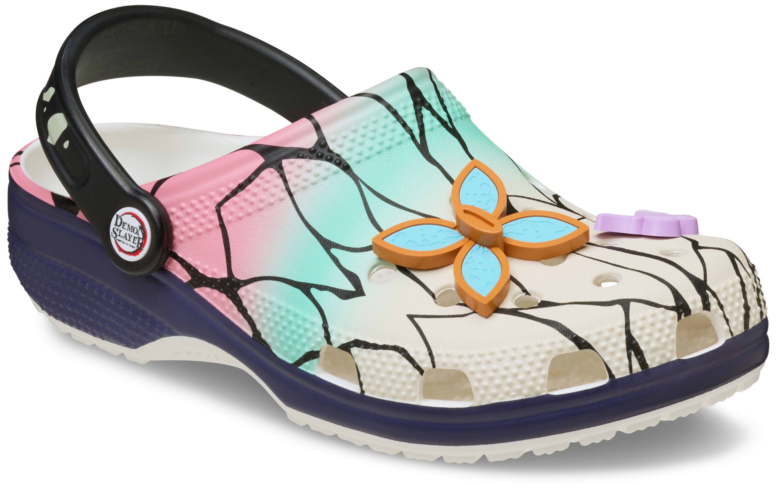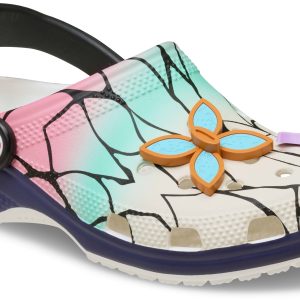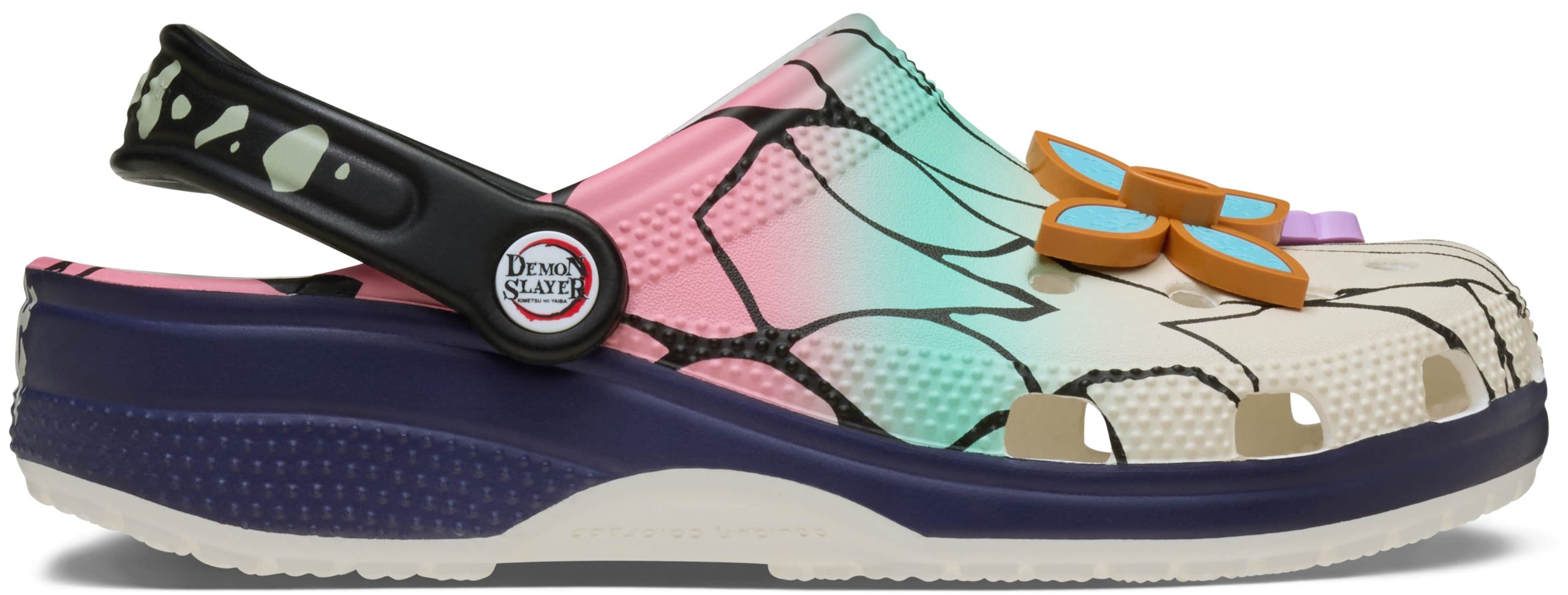 The Shinobu Classic Clog from the Demon Slayer collection embodies the strength and serenity of the Insect Hashira with this ethereal style. These limited-edition clogs feature a gradient coloring of pink, teal, and cream with linework detail like the veins of butterfly wings, reminiscent of Shinobu’s kochou cloak. The Shinobu Classic Clog is adorned with spirited Jibbitz™ charms including her signature four leaf clover tsuba and butterfly charms.