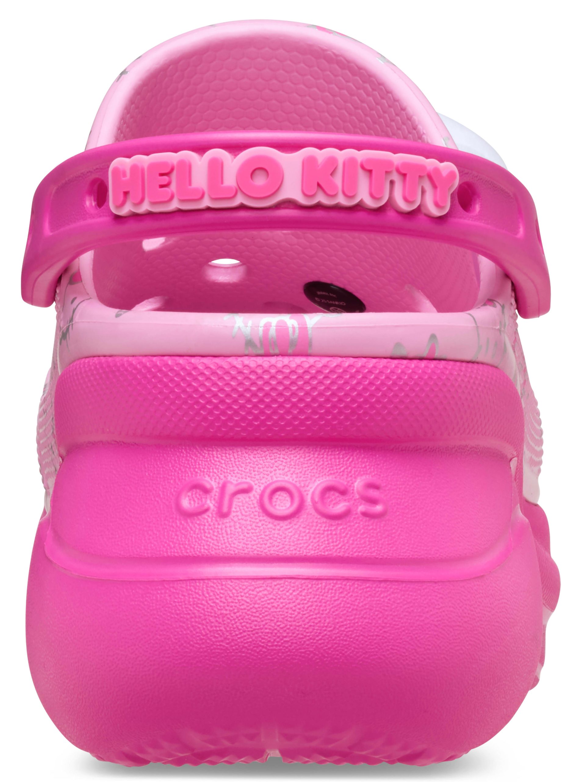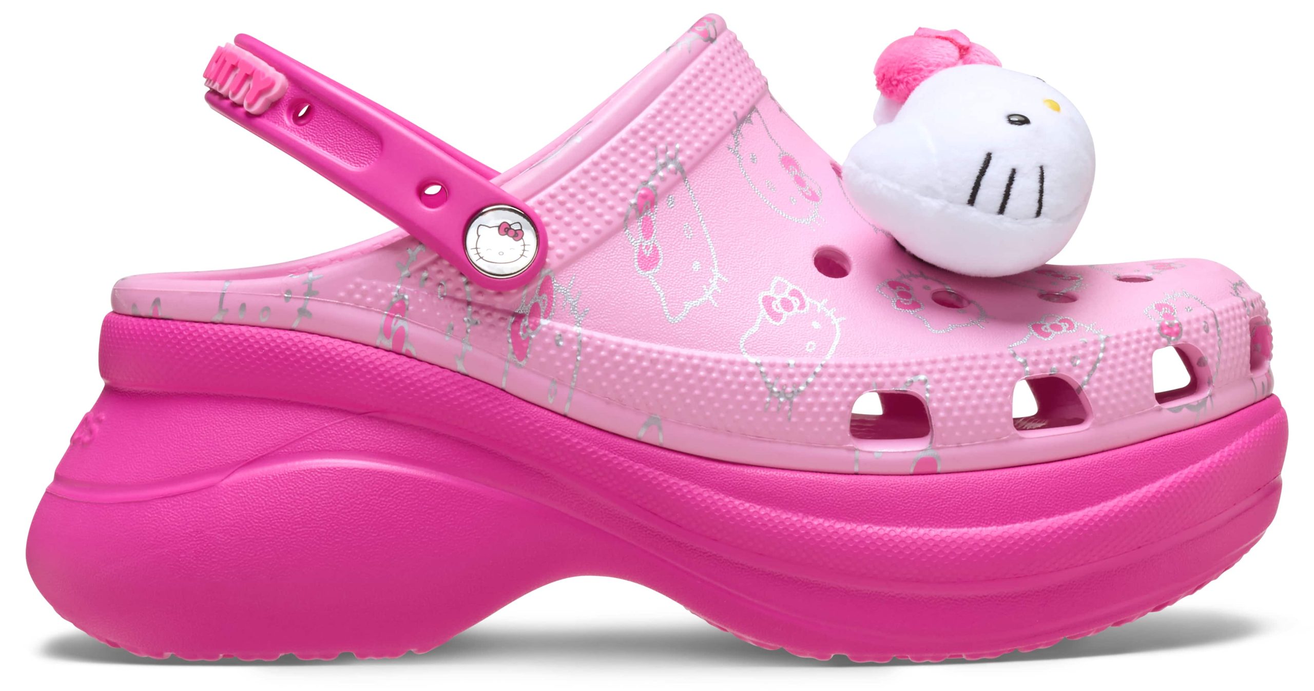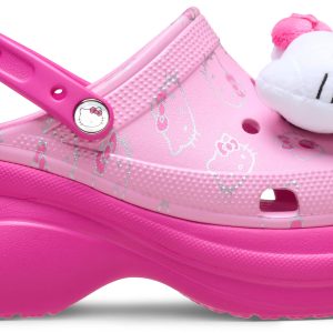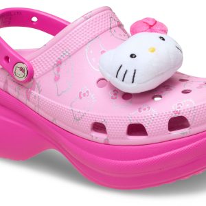 Step up your cute game with Hello Kitty® on the Bae Clog — the ultimate combo of sweet and elevated style. Featuring plush Hello Kitty Jibbitz™ charms, soft pink tones, and an all-over character print, this height-boosted silhouette brings bold energy to every step. With extra cushioning, a chunky platform, and serious charm, it’s a look that says adorable — with attitude.