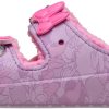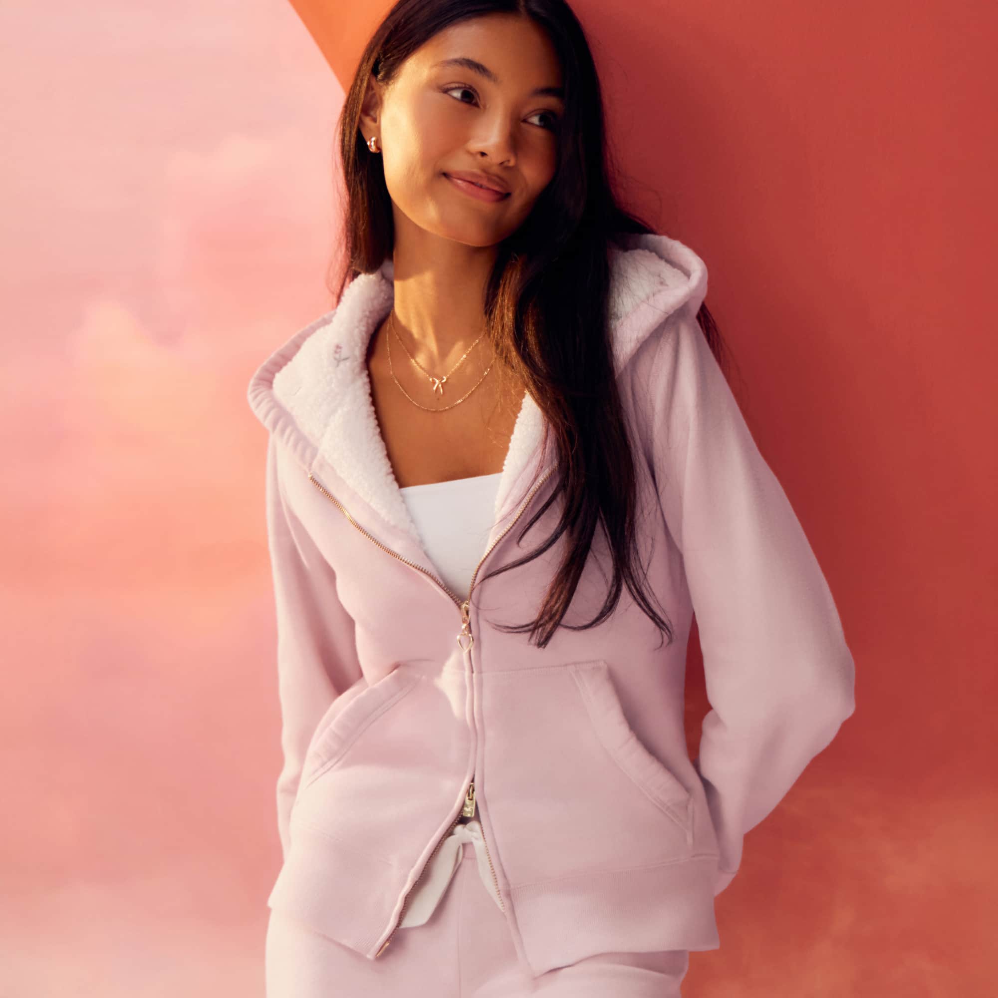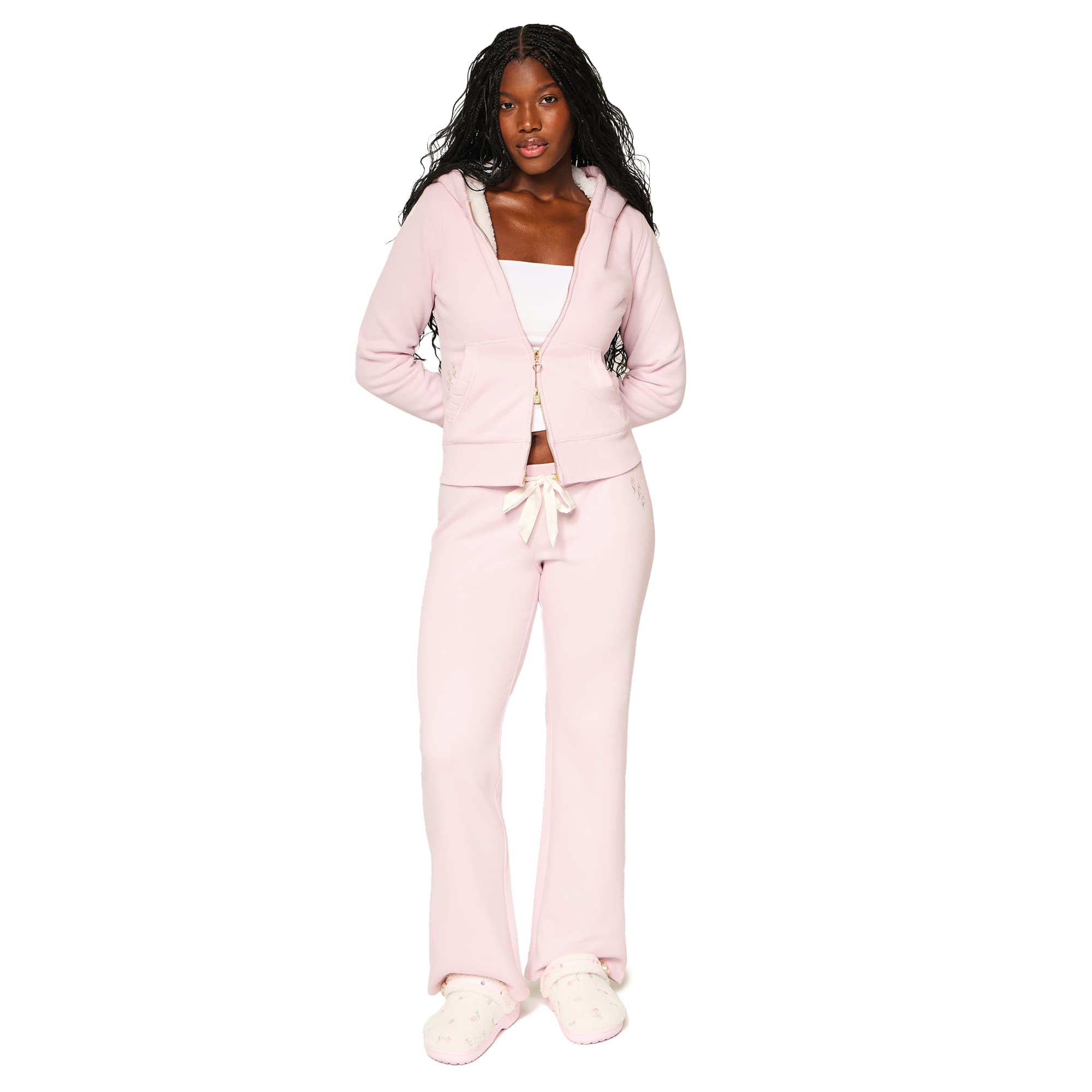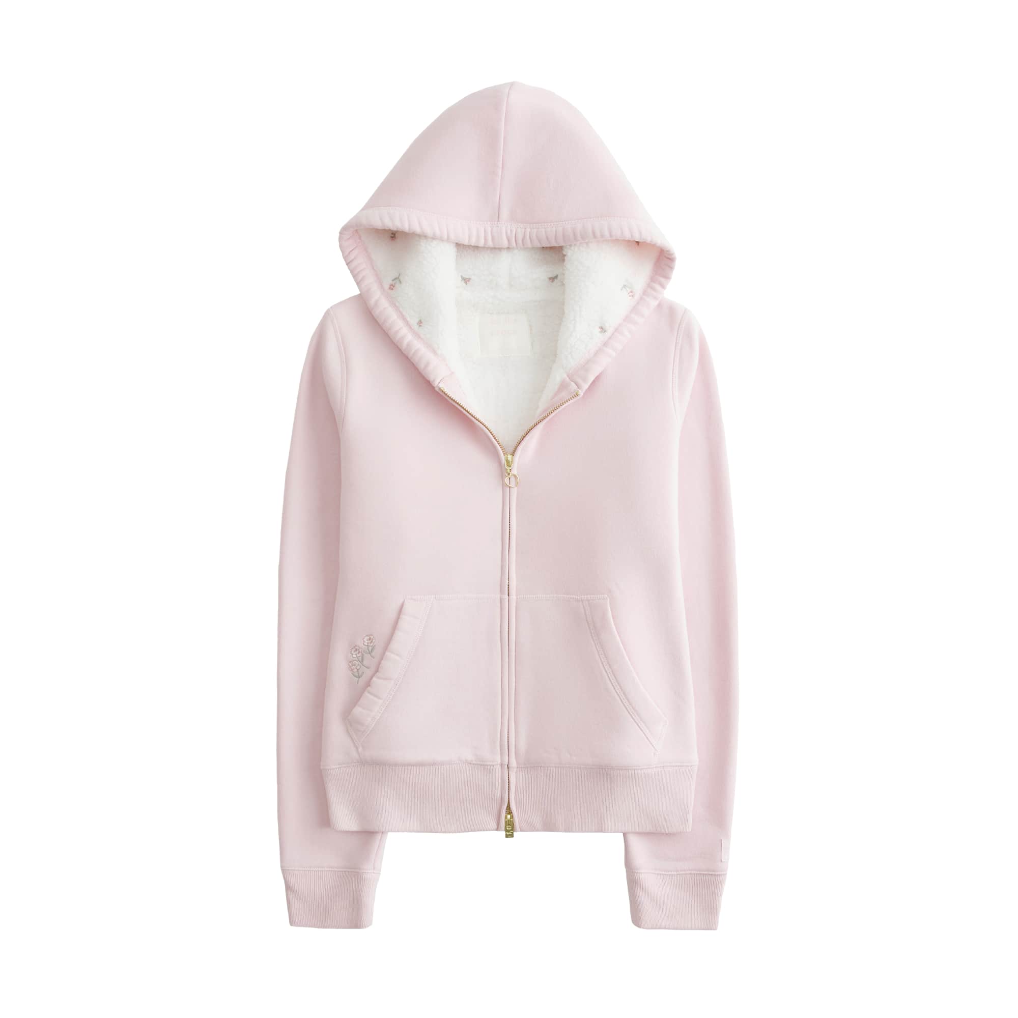 The Hollister x Crocs limited-edition pastel pink hoodie features Hollister’s signature soft sherpa lining with delicate embroidered flowers inside the hood. A heart zipper adorns a full zip-up closure for coverage that’s cute and versatile. Two front pockets are framed with pretty floral embroidery.
