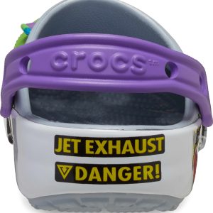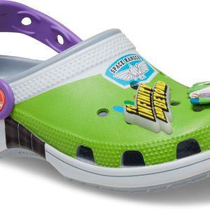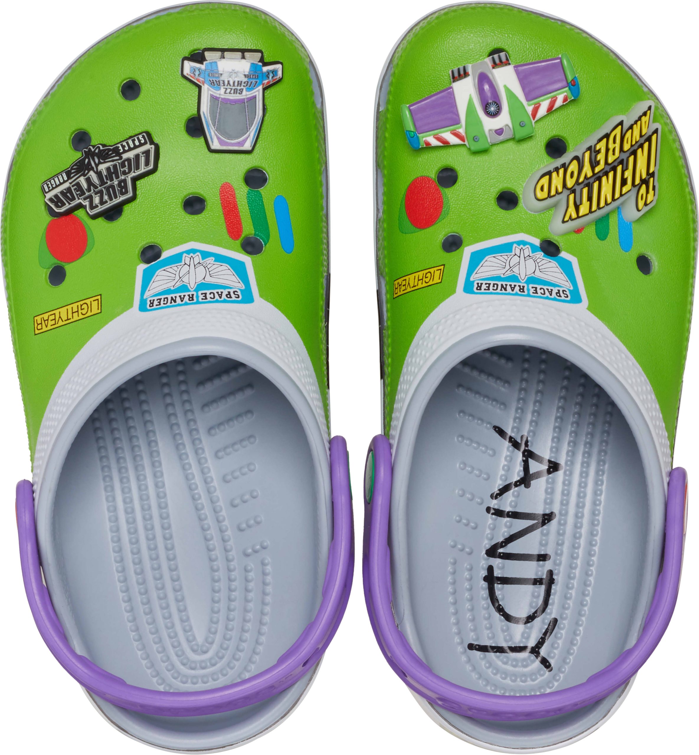 Attention Star Command! The exclusive Buzz Classic Clog has crash landed on a strange planet. This limited-edition style features a fully wrapped print design inspired by the iconic Space Ranger costume, including four exclusive Jibbitz™ charms. These clogs also feature the beloved “Andy” signature on the inside sole.