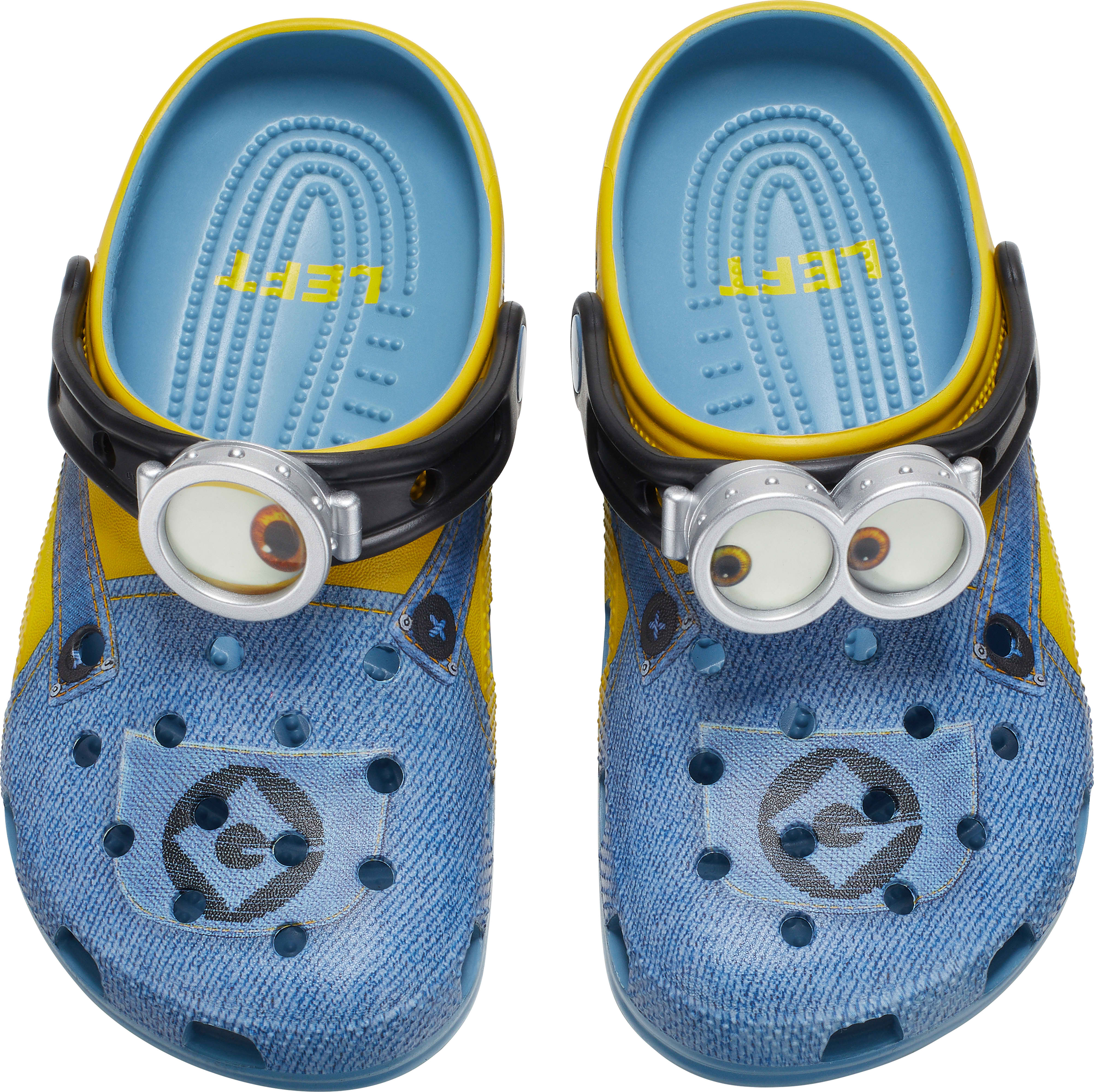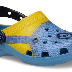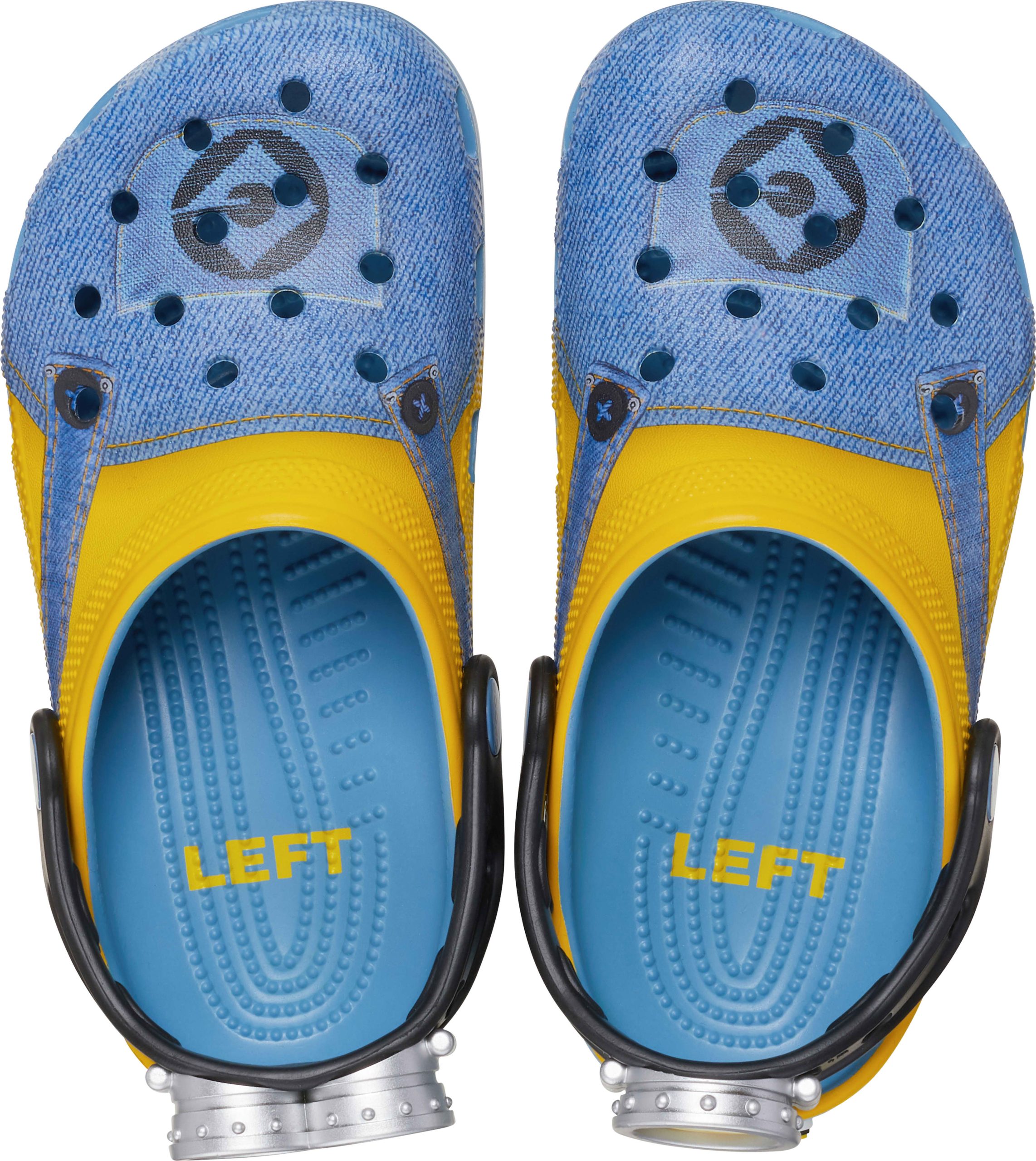 Bello! The Minions Classic Clog is designed to look like your favorite yellow character, complete with printed denim overalls. The ankle strap features an eyeball with goggles, to top off the essential Minions look. Minions logos adorn the rivet and heel, while the entire design is supported by the iconic comfort of Crocs.