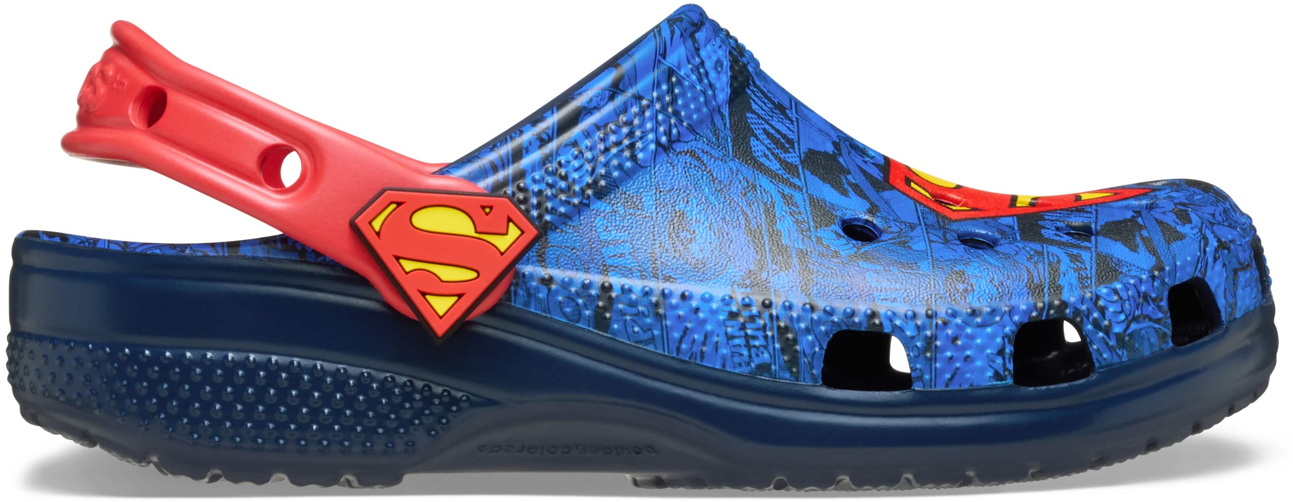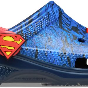 The Superman collection has landed. And the classic Super Hero inspired this Classic Clog. An allover comic book print serves as the background. But the real hero of the design is the Superman S-shield on the upper and rivets. It’s style with a capital “S”.