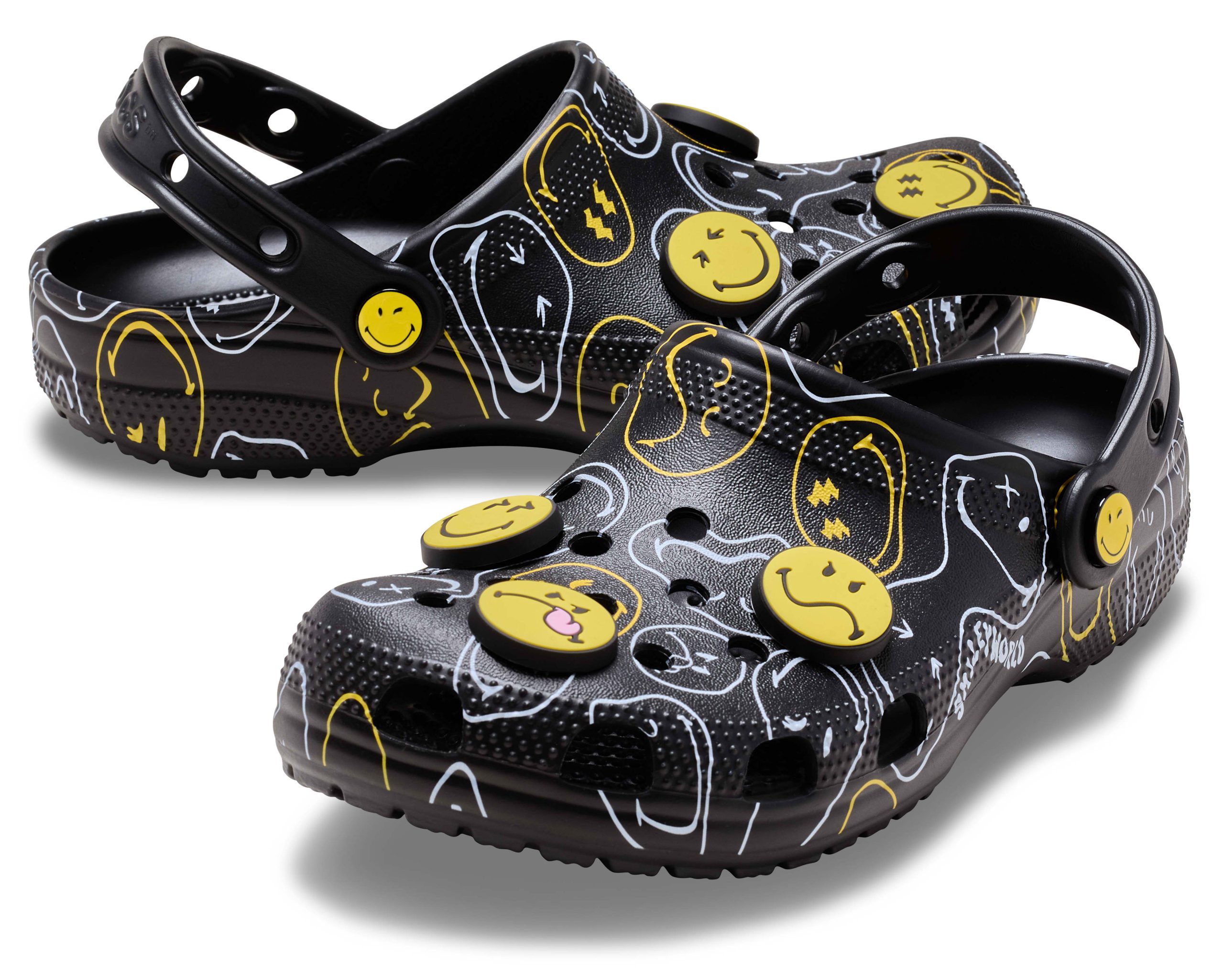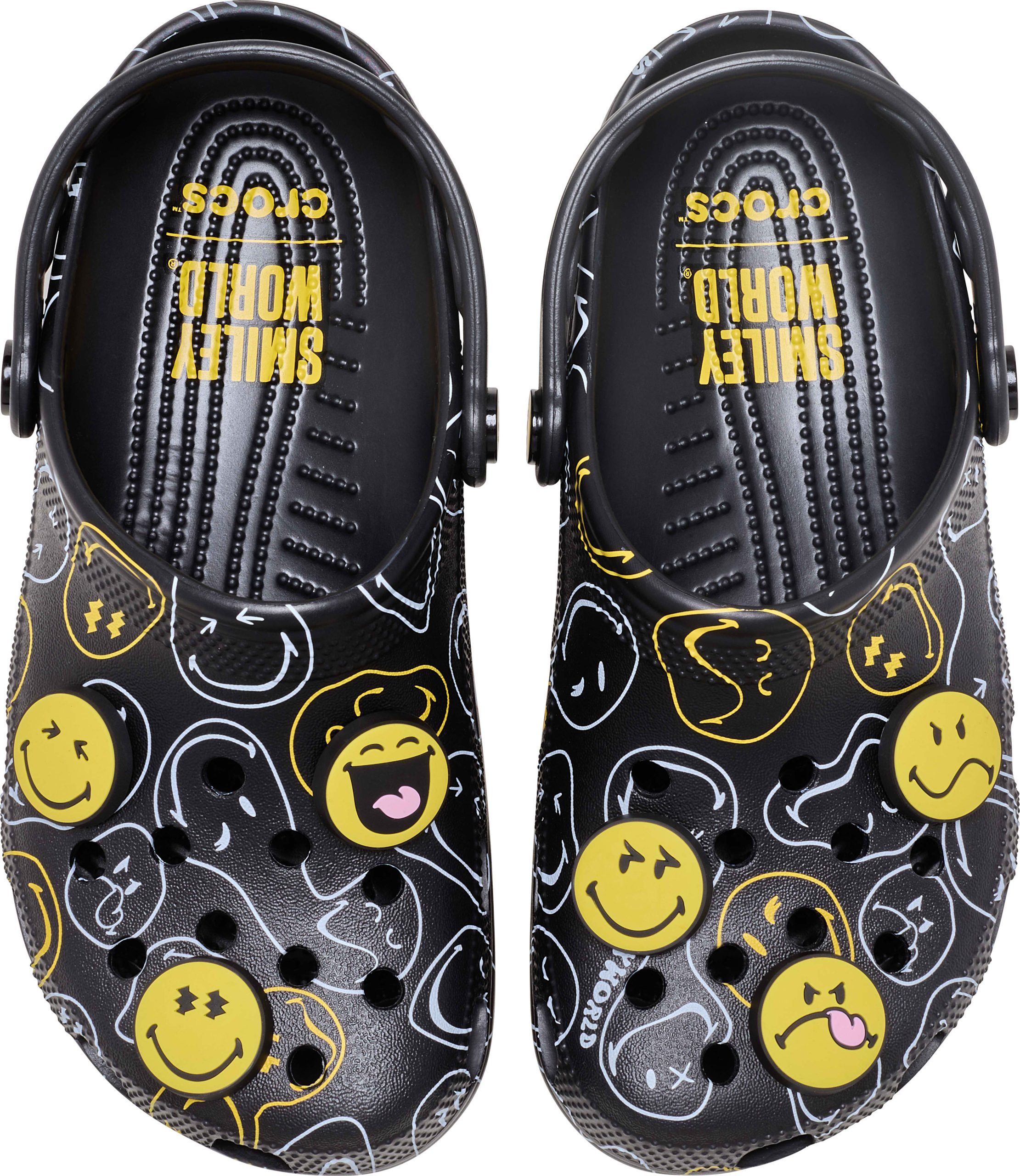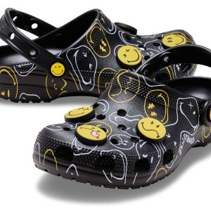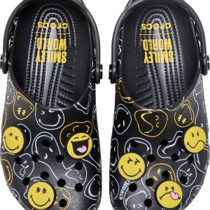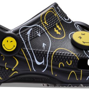 Wear your joy wherever you go in the SmileyWorld® Classic Clog, a playful pair that will have you grinning ear to ear. A comfy Croslite™ sole supports an upper that features an all-over SmileyWorld graphic print and comes pre-loaded with a fun collection of Jibbitz™ charms. Additional room on each shoe allows you to add even more personalization depending on your mood. Dial up the smiles in a style that’s sure to be your new favorite.