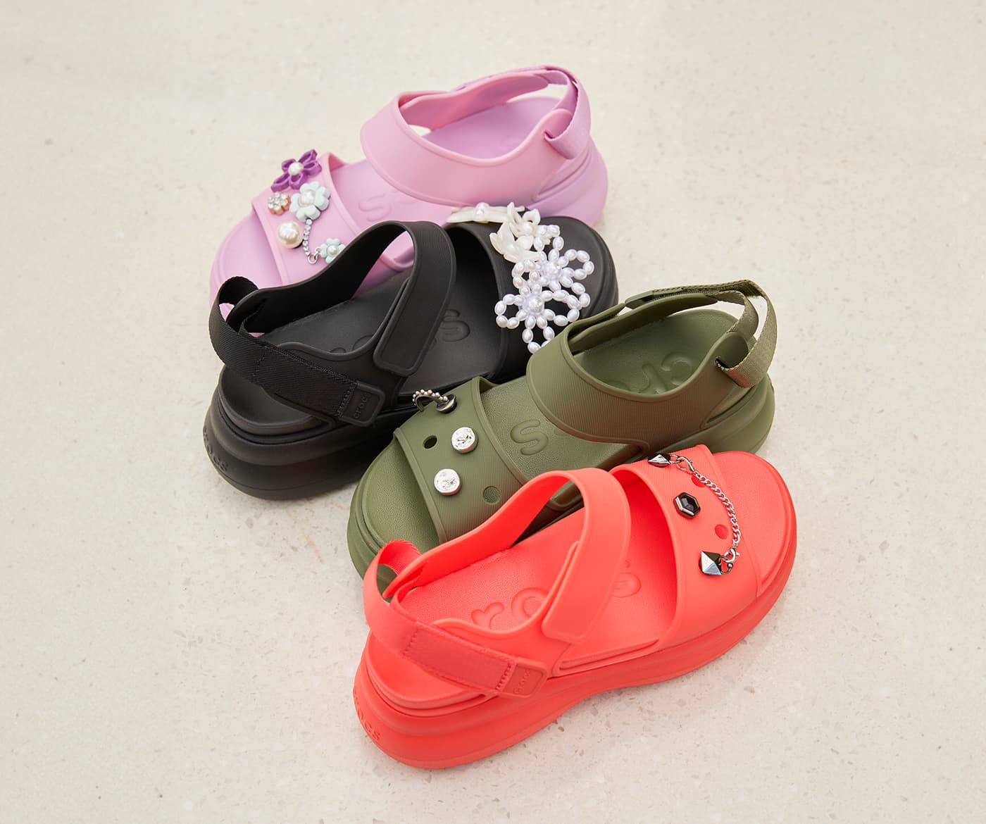 - Customizable with Jibbitz™ charms on the front strap