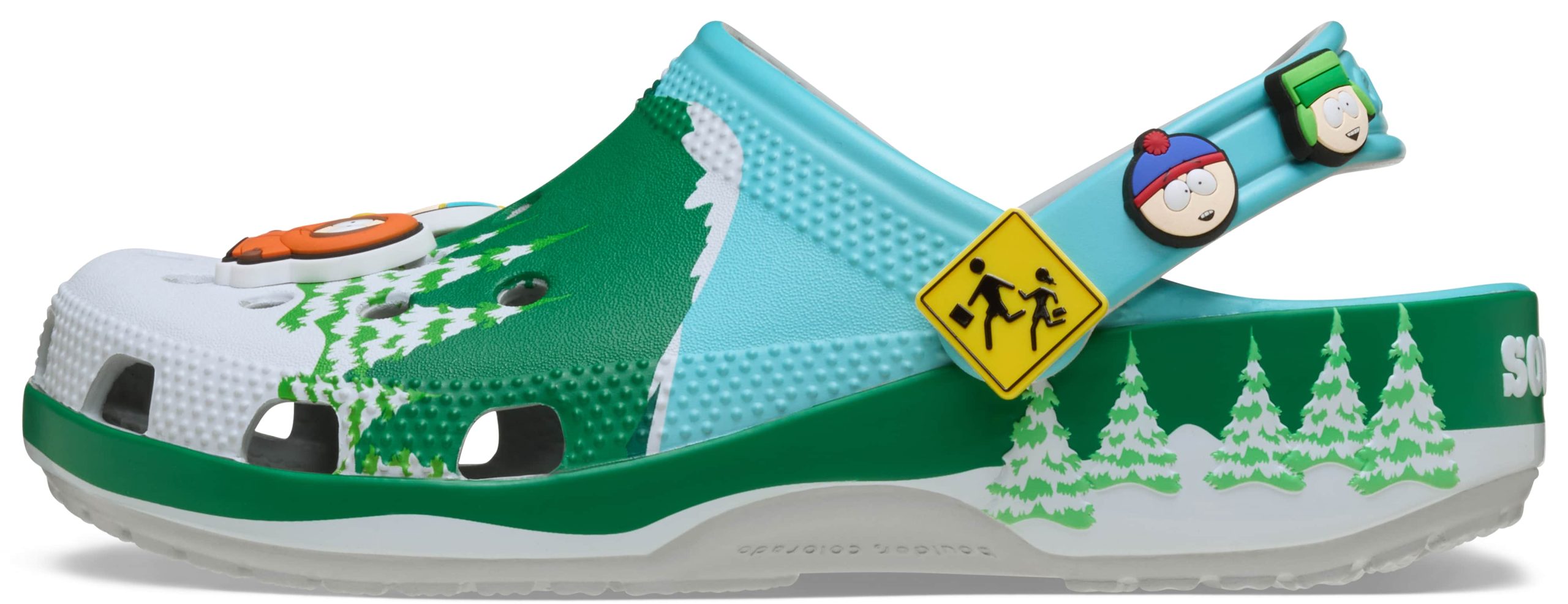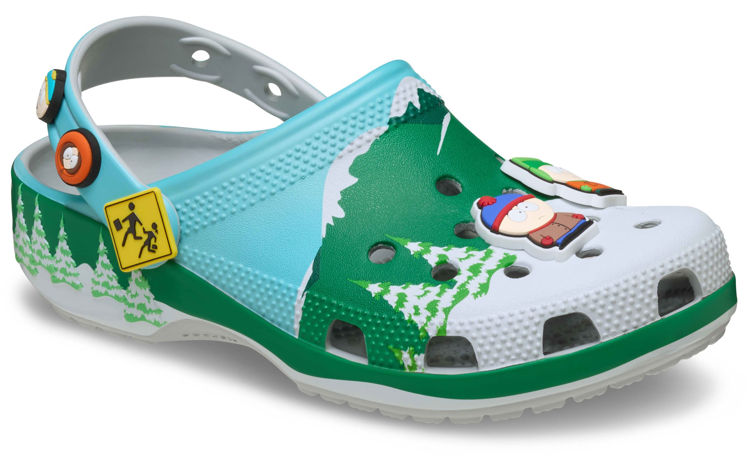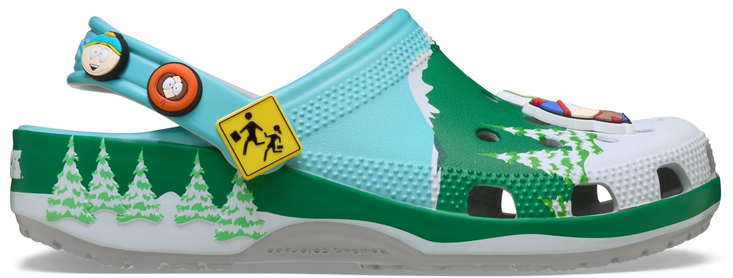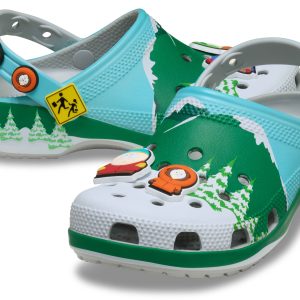 Leave your woes behind with the South Park Classic Clog featuring printed snowcapped peaks, evergreen trees, and that crisp mountain skyline. Stan, Kyle, Cartman, and Kenny line up as exclusive Jibbitz™ charms across the clog’s upper. The pivoting backstrap features the bus stop sign as a rivet, with fan-favorite character faces as additional Jibbitz™ charms.