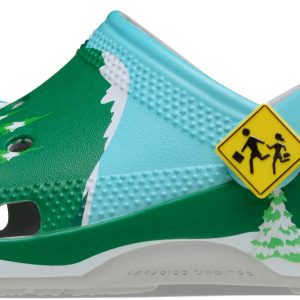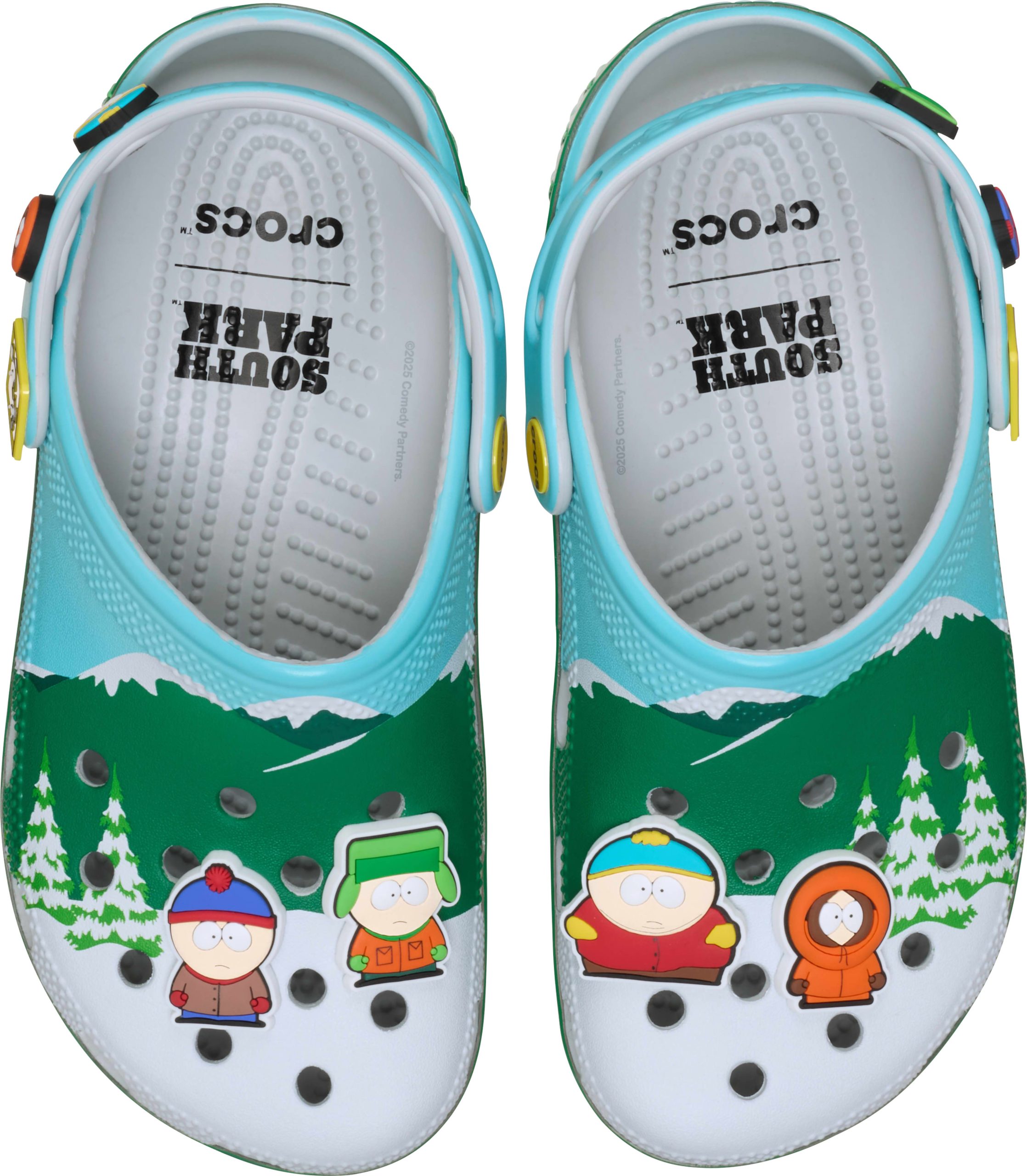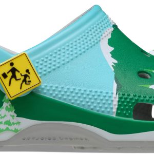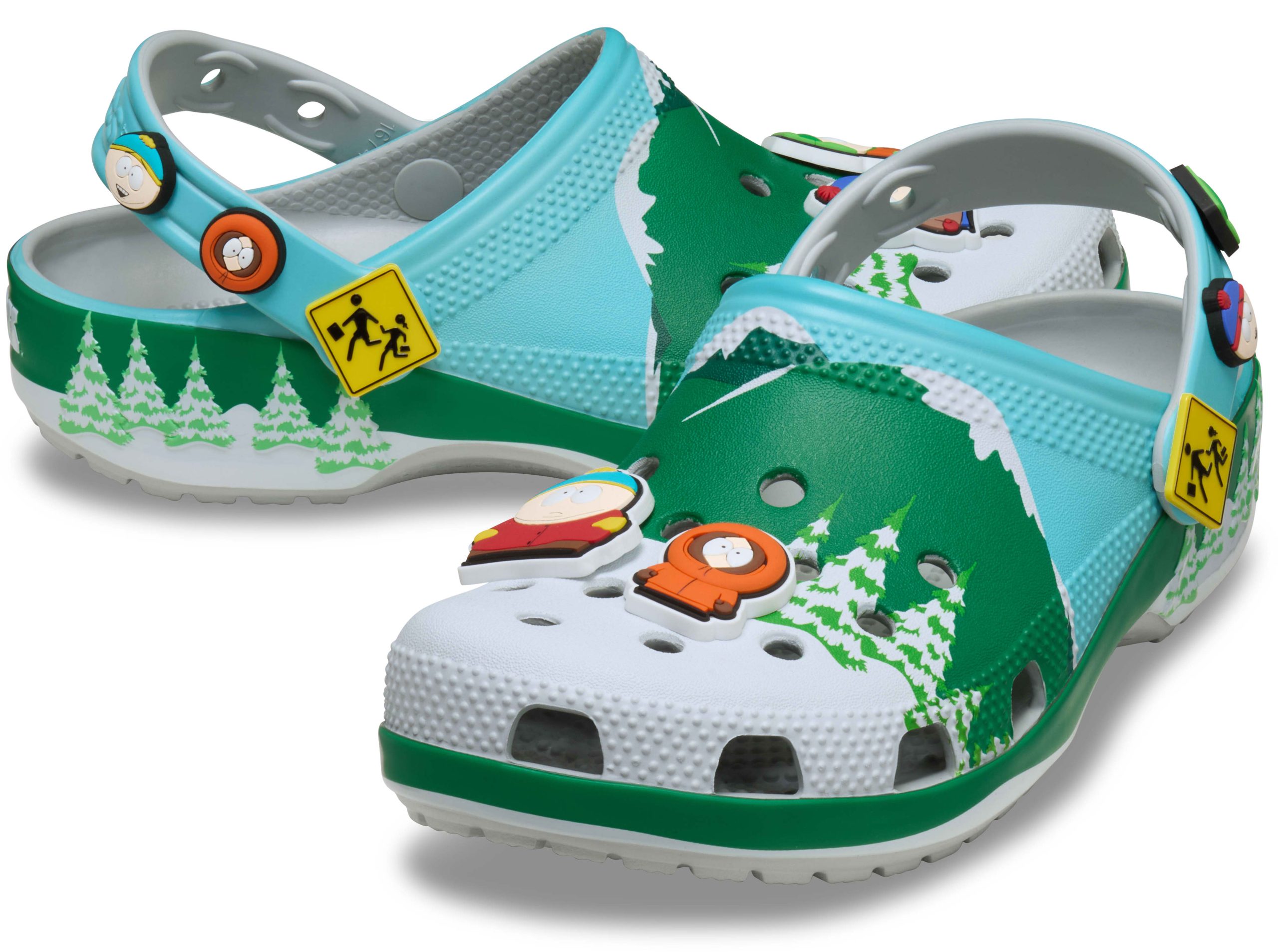 Leave your woes behind with the South Park Classic Clog featuring printed snowcapped peaks, evergreen trees, and that crisp mountain skyline. Stan, Kyle, Cartman, and Kenny line up as exclusive Jibbitz™ charms across the clog’s upper. The pivoting backstrap features the bus stop sign as a rivet, with fan-favorite character faces as additional Jibbitz™ charms.